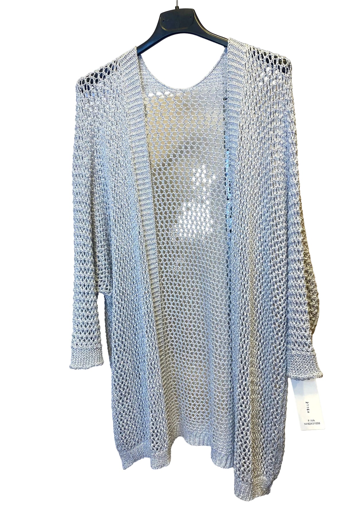 Cardigan leggero e raffinato in rete con filo lamè che cattura la luce con eleganza. La composizione in 75% cotone garantisce morbidezza e traspirabilità, perfetto per le stagioni intermedie.