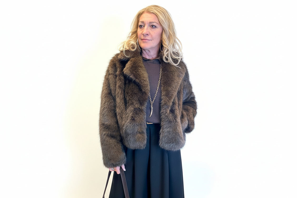 Dal carattere forte e dall'estetica raffinata, questa eco pelliccia è il capo ideale per chi ama distinguersi con stile. Confezionata in un tessuto ultra morbido effetto pelliccia, colpisce per la superficie compatta e vellutata che richiama un'eleganza di ispirazione lusso. La tonalità marrone intensa, calda e naturale, si presta a numerosi abbinamenti, rendendola un passe-partout del guardaroba invernale.